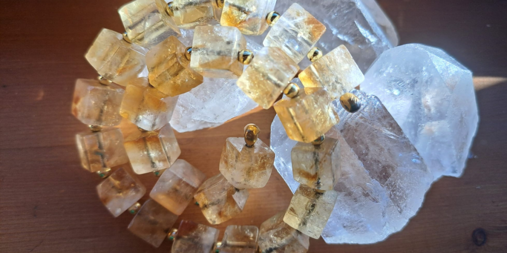 Citrin ist ein gelber bis goldbrauner Edelstein aus der Quarz-Familie und kommt unter anderem in Brasilien, Madagaskar, Russland und den USA vor. Historisch galt Citrin als „Stein des Kaufmanns“ und „Erfolgsstein“, der mit den Eigenschaften wie Förderung von Wohlstand, Erfolg und Überfluss in Verbindung gebracht wird. Er soll helfen, geschäftliche Entscheidungen zu treffen und im Handel zu unterstützen. Seine sonnige Farbe symbolisiert Licht, Lebensfreude und Vitalität.